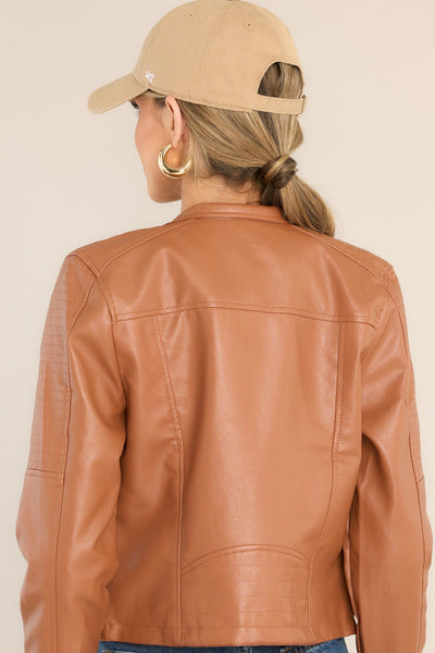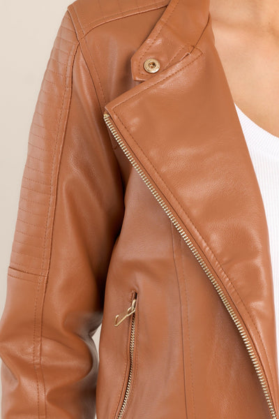 Make a statement worthy of the comebacks you love to give with this Defying The Odds Caramel Faux Leather Jacket. Its edgy flair gives you that challenge-ready look while keeping you warm and comfy! Break the mold and show everyone you're unafraid of the odds. This moto jacket features a snap button at the front of the neck, a zipper down the front, two functional pockets with zipper closures, stitched detailing on the shoulders, gold hardware, and a faux leather finish. Model is wearing a small. 65% Polyester, 35% Cotton ; Outer: 100% Polyurethane Hand Wash Cold Lined 100% Polyester Imported