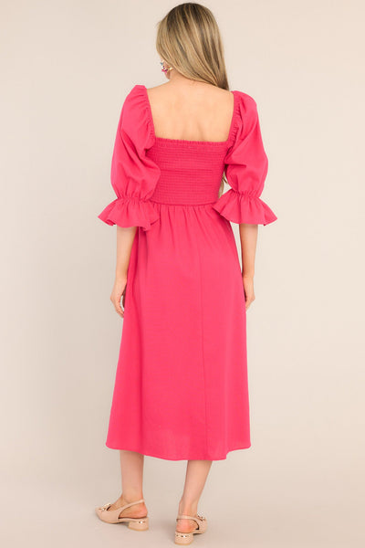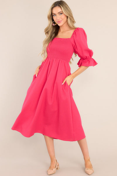 Take some time to Enjoy The View while you'restrolling on cloud nine in this enchanting lipstick midi dress! This sweet silhouette will make you fall in love withall of her adorable details, every time you slip her on! This dress features a square neckline, puff sleeves with elastic cuffs, a fully smocked bust, functional pockets at the hip, and a flowy skirt.