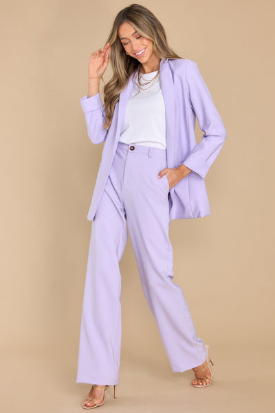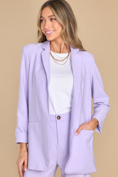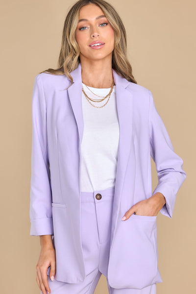 You don't have to say a word when Iput on this beautiful lavender blazer....I Already Know! This jacket is a total upgrade to my boss babe look! Blazer features an open faced collar, shoulder pads, long sleeves, and faux pockets. Model is wearing a small. 95% Polyester, 5% Spandex Hand Wash Cold Lined 100% Polyester Imported