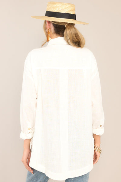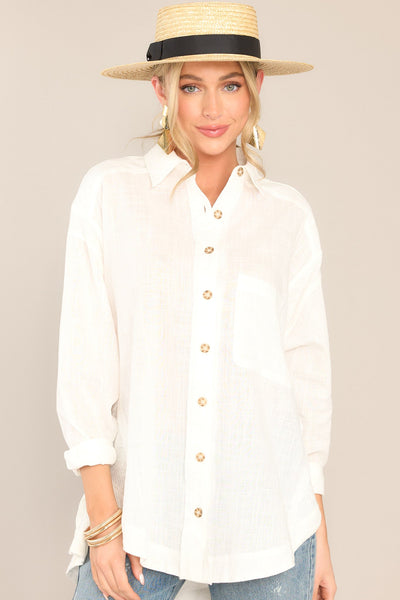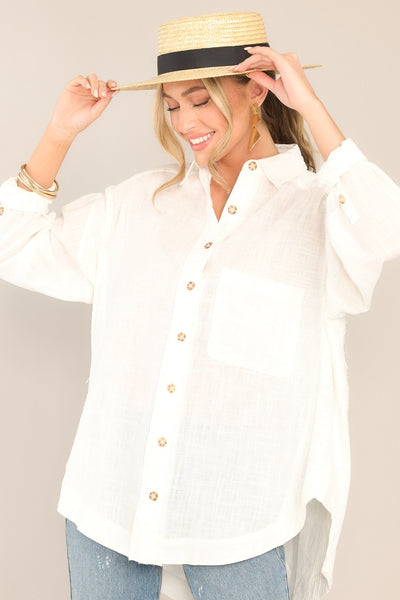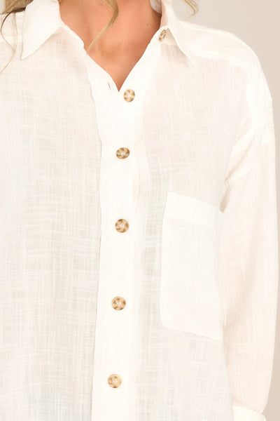 It's Just Me And You against the world, dear chic ivory button down blouse! If I had my way, my closet would be filled with yourfresh and easy essence from top to bottom!This ivory top features a collared neckline, functional buttons down the front, a front side pocket, and buttoned cuffs.