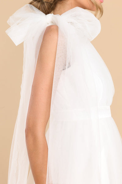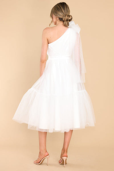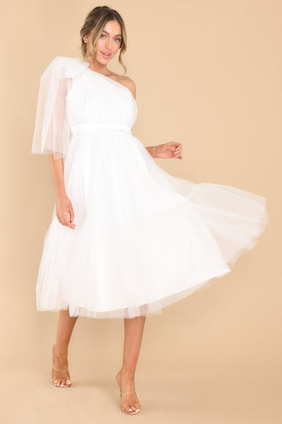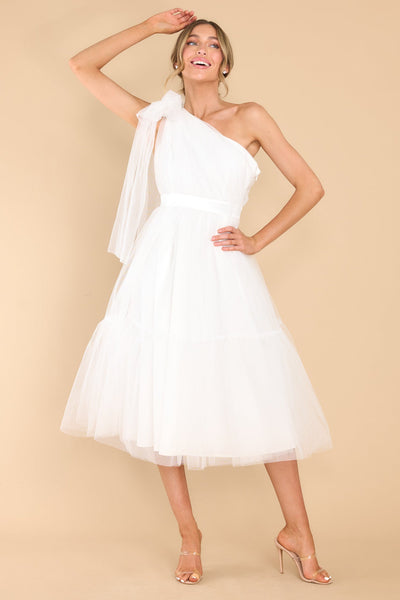 This divine one shoulder white dress is made for a Lifetime Of Love and many seasons of sweet memories! With just aglance at this dreamy midi, I'm ready to get started onmy own fairy tale journey...what about you? This dress features an asymmetrical one shoulder neckline with a bow detail at the top of the shoulder, a side zipper, and an exaggerated skirt. Model is wearing an x-small. 100% Polyester Hand Wash Cold Lined 97% Polyester, 3% Spandex Imported