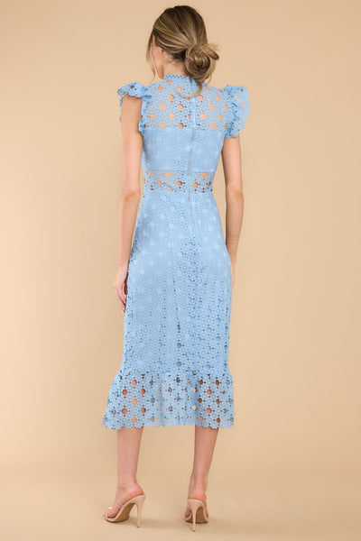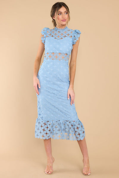 Love's High Hopes have never soaredso far, as when you slipped on this dreamy sky blue crochet midi! Your beauty and sophistication are elevated many times over when you show up in this fitted ruffle dress! This crochet lace midi dress features a high neckline with an illusion sweetheart neckline, ruffled shoulders, a peek-a-boo waistline which gives way into a sheath silhouette fit, and a flounced hem. Dress has a visible back zipper. Model is wearing a small. 100% Polyester Hand Wash Cold Lined 100% Polyester Imported