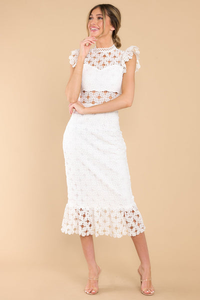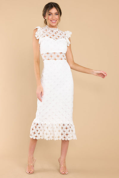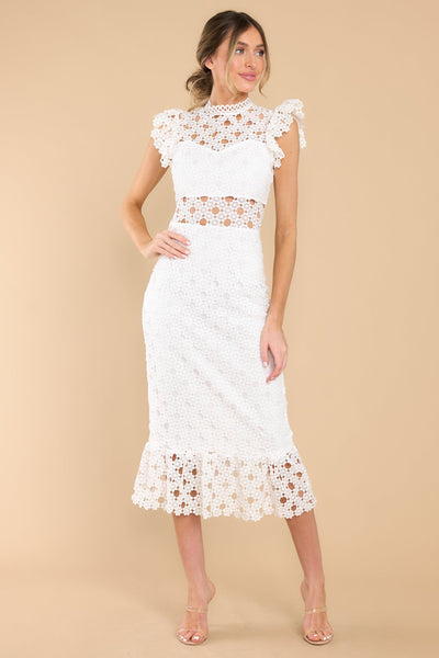 Love’s High Hopes are worth every moment of faith when you’re looking this sweet in your white crochet midi dress! Besides, I’m sure that finding this gorgeous lace dress with that incredible sheath silhouette made at least one of your dreams come true! This crochet lace midi dress features a high neckline with an illusion sweetheart neckline, ruffled shoulders, a peek-a-boo waistline which gives way into a sheath silhouette fit, and a flounced hem. Dress has a visible back zipper. Model is wearing a small. 100% Polyester Hand Wash Cold Lined 100% Polyester Imported