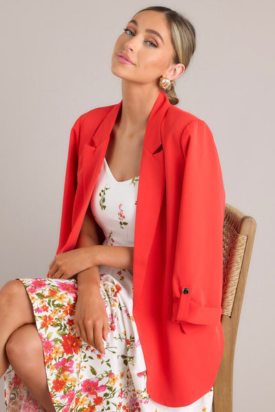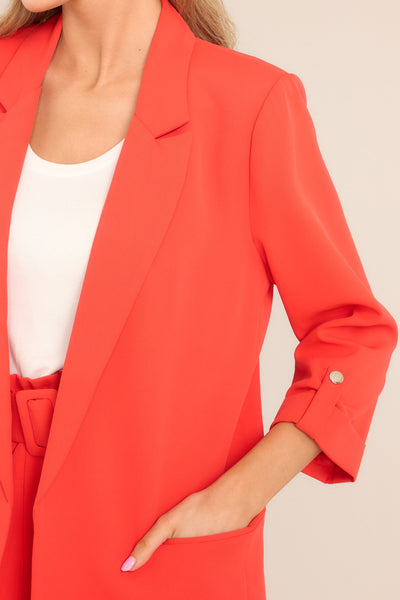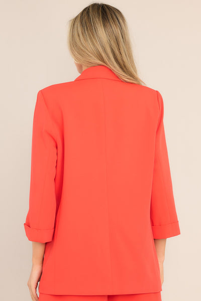 Rock your work wardrobe with our Make It Work Cherry Tomato Blazer! With its vibrant color and trendy design, this blazer will add a pop of fun to any outfit. Made with high-quality materials, it's both stylish and comfortable. You'll be the talk of the office in this unique piece. This blazer features a notched lapel collar, shoulder padding, faux pockets, 3/4 length sleeves, and faux button cuffed sleeves.