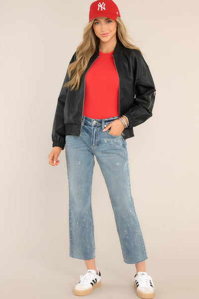 Leave your mark in style with My Legacy Black Faux Leather Bomber Jacket. This daring and fierce jacket will elevate any outfit and make a bold statement. Don't wait, make your legacy known now!Jacket features a zipper front, side pockets, and elastic sleeve cuffs.