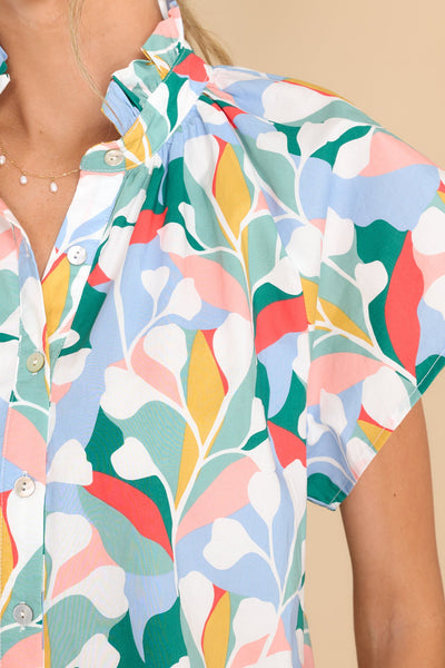Sail away in style with this vivid, Sailing Away Sky Blue Multi Print Top! Perfect for the fashionista who likes to have a bit of fun when it comes to dressing up! This cotton top features a ruffled faux collar neckline, flutter sleeves, and functional buttons down the front.Model is wearing a small. 100% Cotton Hand Wash ColdUnlined Imported