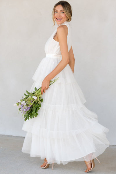 I could use a little Shock And Awe in the fashion department this season! What better way to make a stunning appearance to my next special event, than in this ruffled whitemaxi dress?! I love to leave them speechless when I wear a breathtaking silhouette like this pretty halter style gown!This dress features a high neckline with ruffle detailing, a button closure at the back of the neck with a keyhole cutout, a zipper in the back, and a long tiered skirt. Model is wearing an x-small. 100% Polyester; Contrast: 97% Polyester, 3% Spandex Hand Wash Cold Lined Imported