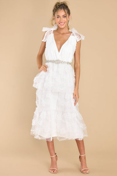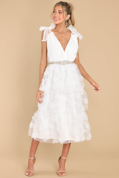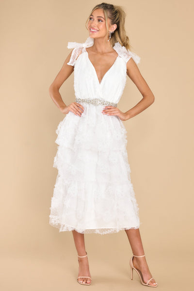 *Grand Gestures Silver Crystal Belt sold separately. Does NOT come with Stolen Glances White Midi Dress.*