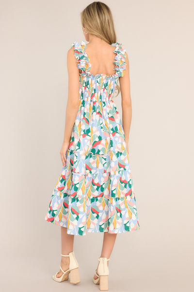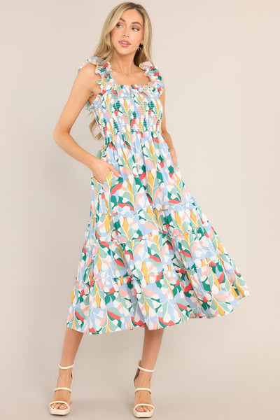 Look oh-so-cute in this Such A Dreamer Sky Blue Multi Print Midi Dress. Featuring a fun print, it's the perfect piece to help you dream it & do it - all while turning heads! This cotton dress features a square neckline, elastic ruffle straps, a fully smocked bust, and a ruffle-tiered skirt.