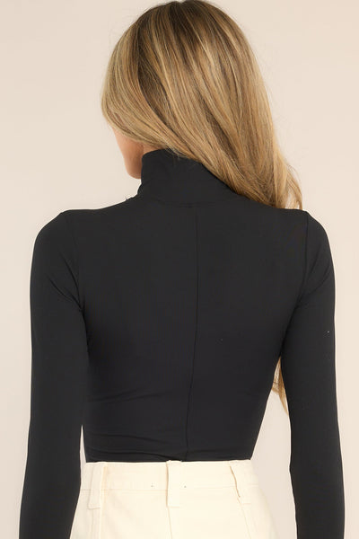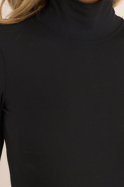 Show off your style with the Suit Yourself Ribbed Long Sleeve Black Turtleneck Bodysuit. With a form-fitting design and ribbed texture, this bodysuit is perfect for layering or wearing on its own. Keep it classy and chic with this versatile piece.
