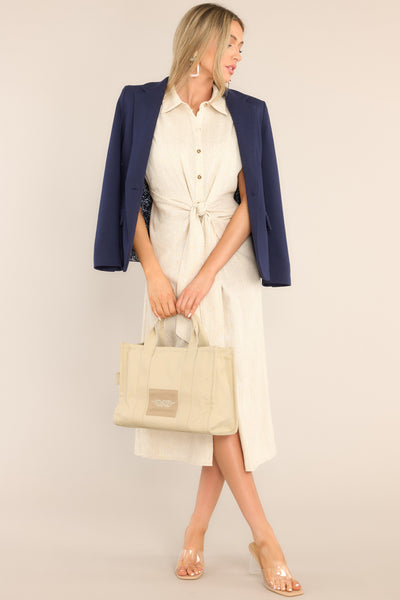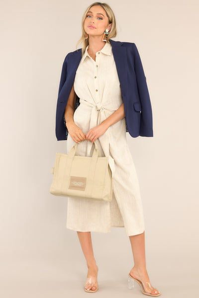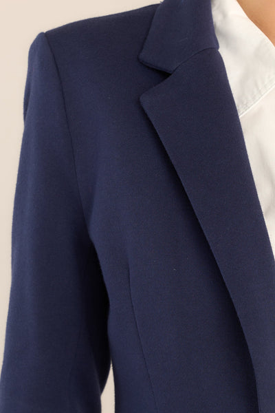 Conquer the world (or at least the fashion world) in our World Is Yours Navy Blue Ponte Blazer. This sharp navy blazer adds a touch of sophistication to any outfit, making you the boss of style. Don't settle for ordinary, rock this blazer and make a statement. This blazer features a notch lapel collar, shoulder pads, a functional button, faux pockets, and faux buttons on the sleeves.Perfect for both work and play, it's a versatile piece that will elevate any outfit.